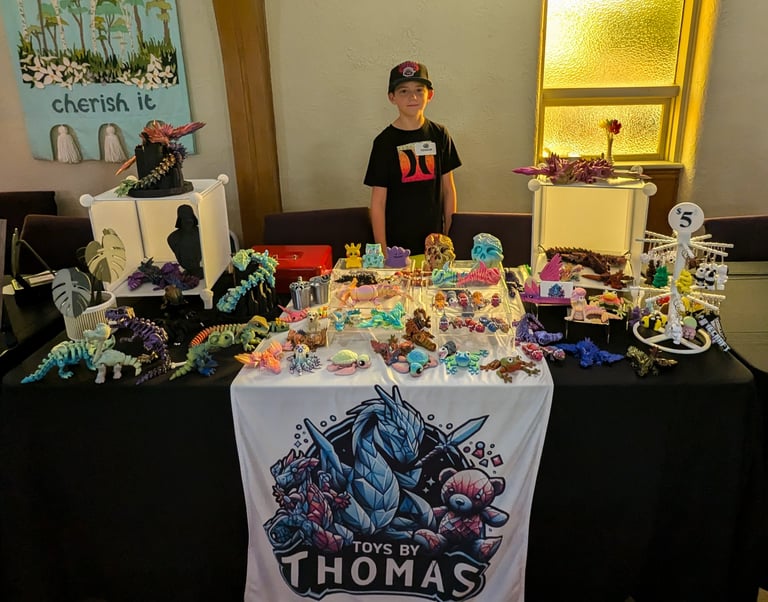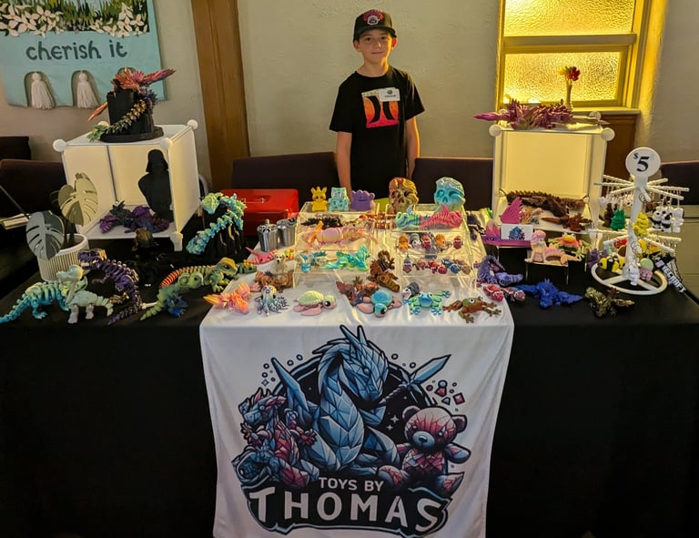 Thomas decided to showcase some of his custom prints at one of the local craft markets where his mom was a vendor. To his delight, his creations were a hit! This success motivated him to continue pursuing his newfound hobby, and for the past two summers, Thomas has been a regular at various markets, selling his unique 3D printed toys and items.